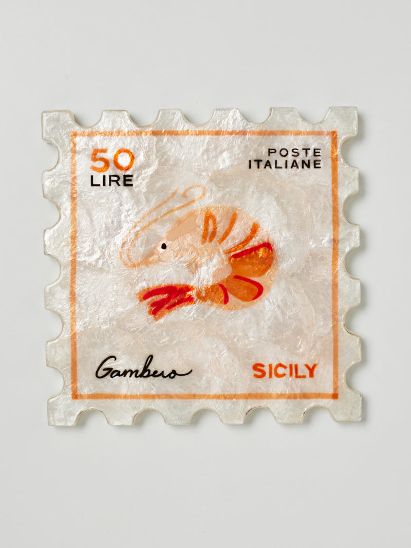 Bring vintage Italian charm home with the super cute Gambero Stamp wall tile. Handcrafted from luminous capiz shells, it boasts an iridescent shimmery finish. The tile is a classic postage stamp design with an intricate perforated edge pattern featuring a striking prawn image. Rich pink shades, decorative flourishes, and calligraphic text evoke old-world Italian elegance. Perfect for accent walls or niche walls, this artisan tile adds Mediterranean flair with its natural materials and hand-painted designs inspired by the sunny warmth of Italy.